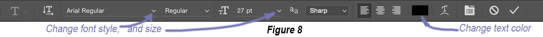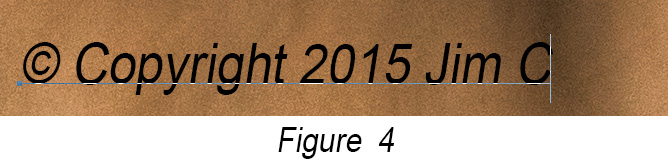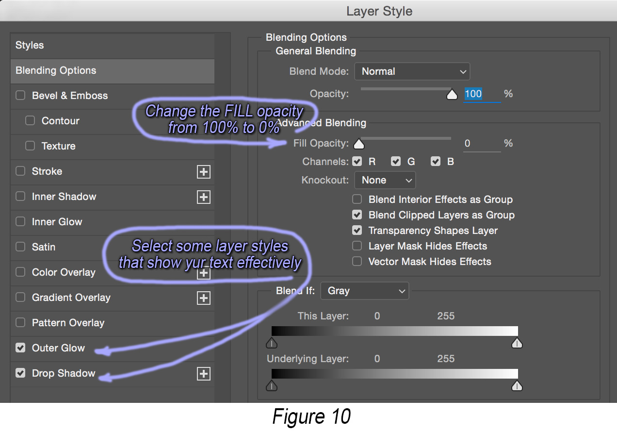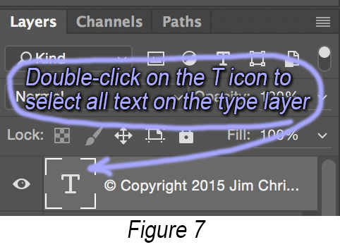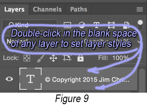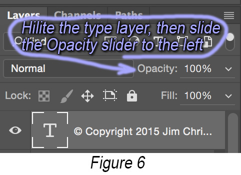 To create a text overlay in Photoshop (or Elements), select the type tool (Fig.3), then click and type anywhere in the image to create a new type layer (Fig.4). You can move the text using the move tool (Fig.5), and the lower the opacity (Fig.6) for a more subtle effect. You can change the text, font, and color by double-clicking the T icon on the type layer (Fig.7) and changing the parameters on the options bar (Fig.8). Nice-looking results can be achieved by double-clicking the blank area on the right side of the type layer (Fig.9), and then setting the fill level to zero and enabling layer styles such as outer glow and drop shadow in the layer styles popup window (Fig.10).