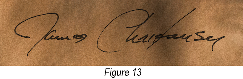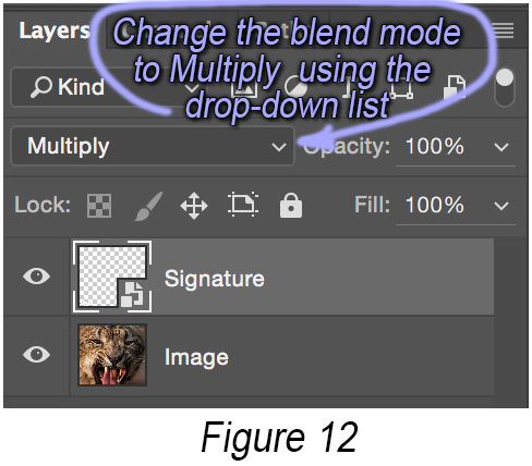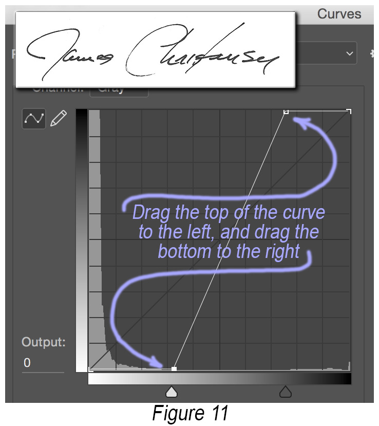 To sign your photos in your handwriting, first create a digital image of your signature by scanning your signature with a flatbed scanner. Crop your signature image in Photoshop, and adjust the relative brightness (using a curves or levels adjustment) so that the paper is as close to 100% pure white as possible, and the ink is as close to 100% pure black as possible (Fig.11). To sign a photo, add that signature image as a new layer using the Photoshop menu File / Place