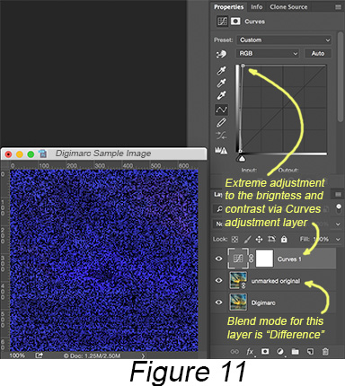 Naturally I was curious about how the Digimarc code works. A few quick Google searches turned-up nothing, and a more scholarly search turned-up papers whose mathematics would take some time to understand. So I did a simple experiment as shown in figure 11. The bottom layer in our example is watermarked with Digimarc's plug-in. The layer above it is the exact same image but without the watermark. I set the blend mode of the unmarked layer to Difference