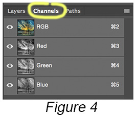 [4] Why is the image b/w and not blue, since we're looking at the blue channel? Since the blue channel is just a monochromatic image, Photoshop shows it to us using shades of gray (instead of shades of blue) so we can see it more clearly In fact the R,G,B channels are all monochromatic images, and get colored only when software interprets them using the agreements established by the image file format (for example, JPEG).