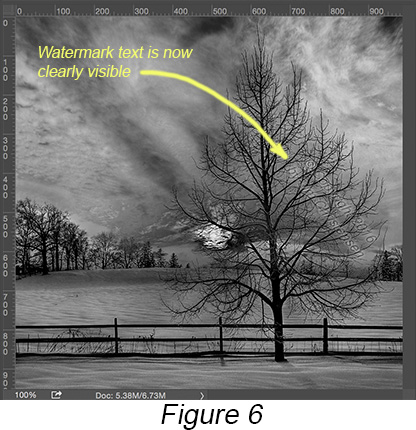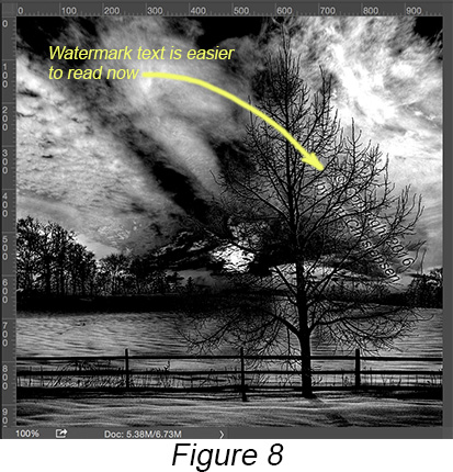 That may be all you have to do, but this technique is dependent on the image content. Your goal is to fine-tune the watermark so it's invisible when viewed normally, but clearly visible when viewed as described in next step.
