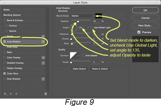 , set the Angle to 135, and change the Blend Mode from Multiply to Darken (esp if the watermark was too strong). The shadow color should be black. Figure 9 shows these adjustments. Now drag the Opacity slider left and right to vary the strength of the dark inner tones of the watermark text. You'll want to check this both when viewing the combined R,G,B channels (for invisibility), and the blue channel alone (for detectability).